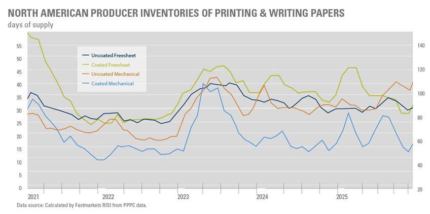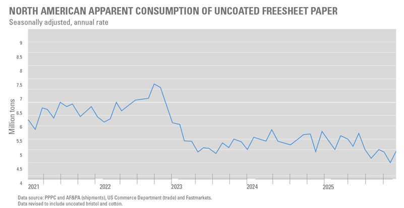 The exit of uncoated freesheet from IP’s Riverdale mill, combined with the closure of Pixelle Specialty Solutions’ Chillicothe mill in August, the third-largest producer of uncoated freesheet paper in North America, could result in the market’s operating rates rising to 92% in 2026. Hence, the already announced price increases for 2026 are going into effect as we write this update.